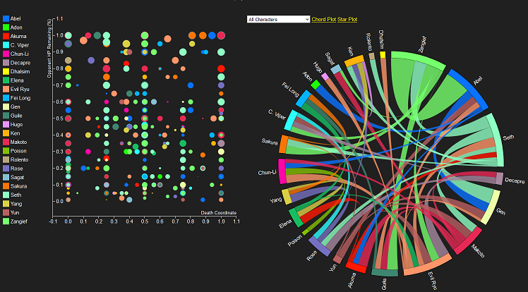 This data visualization is an experimental visualization that allows a user to explore a set of Street Fighter games. Insight can be gained on characters, match ups, common win/loss conditions, and an overall examination of the metagame. The purpose is ultimately is the examination of a player's weaknesses, and also how the game develops when managing the balance of the game.